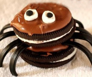 Puedes conseguir unas simpáticas arañas como las de la foto poniendo unos palitos de chocolate, simulando unas patas, dentro de una galleta de chocolate rellena.
