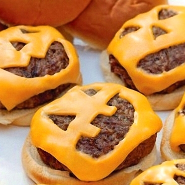 Cuando las hamburguesas estén listas, ponlas sobre las rebanadas de pan, y añade encima la loncha de queso con la forma de calabaza. ¡Listas!
